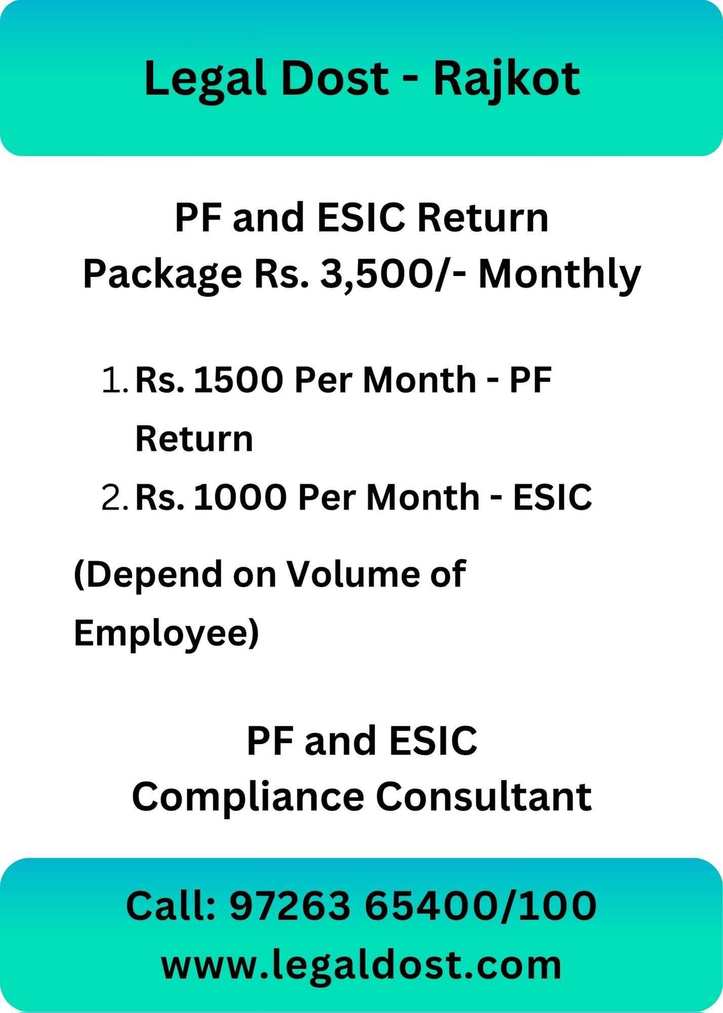 Looking for hassle-free PF and ESIC filing in Rajkot? Our affordable package offers peace of mind at just ₹1500 per month for PF returns and ₹1000 per month for ESIC returns. Ensure compliance and avoid penalties with our expert services. Contact us today!